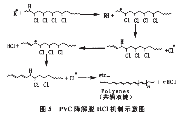 PVC樹(shù)脂降解脫HC1是型材變色的主要內(nèi)部因素,其降解機(jī)制示意圖見(jiàn)圖5。