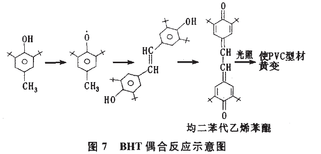 目前。PVC型材生產(chǎn)廠家使用的穩(wěn)定劑以復(fù)合穩(wěn)定劑為主,除了對(duì)PVC降解起穩(wěn)定作用的主體化合物。還包含潤(rùn)滑體系、抗氧體系等助穩(wěn)定體系。其中的抗氧體系可能包括酚類(lèi)穩(wěn)定劑和亞磷酸酯類(lèi)助穩(wěn)定劑。這些化合物可能含有易變色的有機(jī)雜質(zhì),另外它們自身有可能在光、氧、水的作用下發(fā)生變色反應(yīng)。有資料報(bào)道指出,某些亞磷酸酯類(lèi)產(chǎn)品可能含有顏色污染性成分。常用的亞磷酸酯類(lèi)產(chǎn)品有亞磷酸酯三苯酯(TPP)和亞磷酸一苯二異辛醇(PDLOP),其中TPP由苯酚和三氧化磷反應(yīng)制得。苯酚是一種化學(xué)性質(zhì)不穩(wěn)定的物質(zhì),它在光照下會(huì)發(fā)生互變異構(gòu)反應(yīng),呈紅褐色。如果TPP生產(chǎn)過(guò)程控制不嚴(yán),會(huì)造成產(chǎn)品羥基值過(guò)大,即殘留較多的苯酚單體,這樣的產(chǎn)品就可能導(dǎo)致型材在室外貯存或應(yīng)用時(shí)發(fā)生變色現(xiàn)象。即使TPP無(wú)殘留苯酚單體,因其水解穩(wěn)定性差,在潮濕、光照和受熱條件下會(huì)水解生成苯酚單體,也使型材變色。某些低空間位阻效應(yīng)的酚類(lèi)抗氧劑(如BHT),可能在紫外線照射、一定的濕度和氧的條件下發(fā)生偶合反應(yīng)(如圖7所示)。