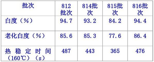 4個批次料的白度、老化白度及熱穩(wěn)定時間的測試結(jié)果如表1所示。