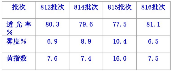 由表2可知:第815批次料的光學性能明顯比第812批次、第816批次差,尤其是黃色指數(shù)和霧度大大高于后者;而色澤稍差的第814批次料的霧度高于第812批次、第816批次,但低于第815批次。