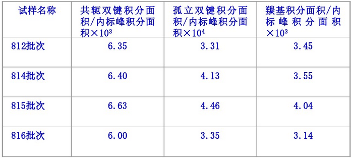 由表3可知:4個批次樣品的分子質(zhì)量接近,分子質(zhì)量分布基本一致,沒有明顯差異。由此可知,第815批次料色澤較差與分子質(zhì)量及其分布無關(guān)。