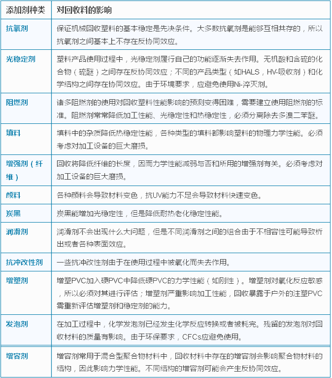在回收塑料過程中,不同添加劑之間會出現(xiàn)協(xié)同效應(yīng)和反協(xié)同效應(yīng),但是,大多數(shù)情況下,不同來源的混合添加劑之間經(jīng)常產(chǎn)生消極效果。(轉(zhuǎn)自塑料網(wǎng))